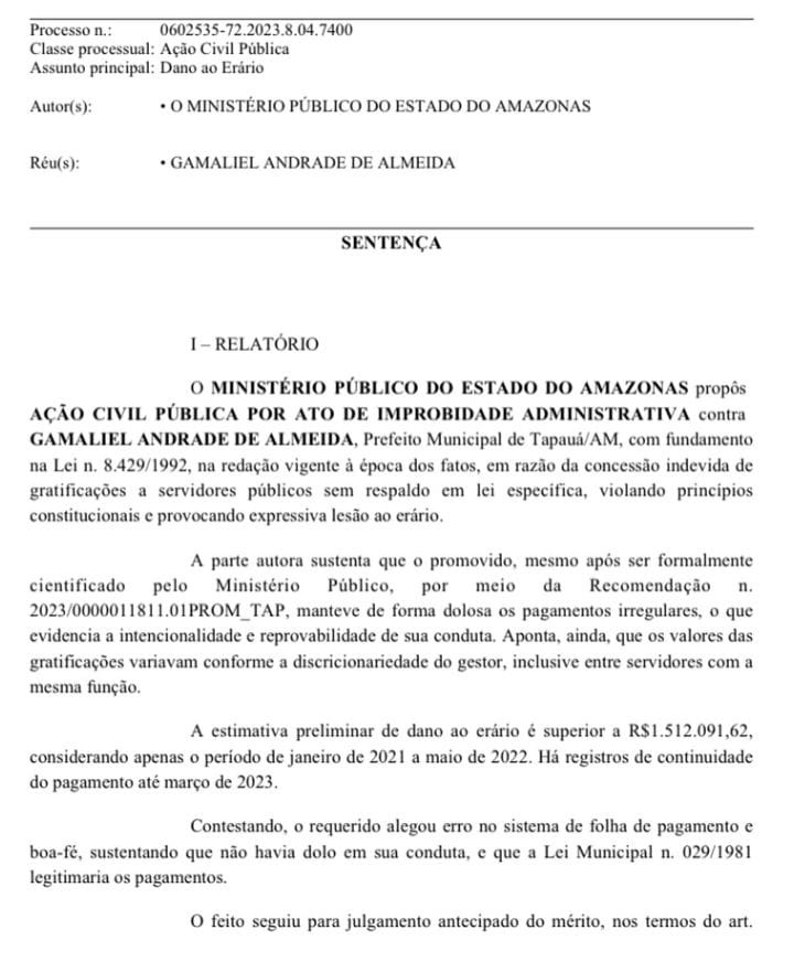 A Justiça do Amazonas condenou o prefeito de Tapauá, Gamaliel Andrade de Almeida, por ato de improbidade administrativa após autorizar o pagamento de gratificações indevidas a servidores públicos, sem respaldo em lei específica. De acordo com a sentença, os atos ilegais causaram um rombo superior a R$ 1,5 milhão ao erário.