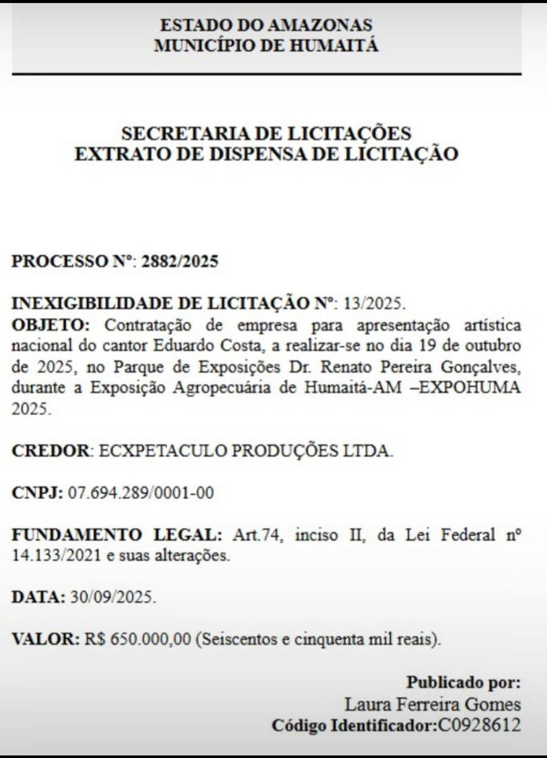 O Extrato de Dispensa de Licitação (Inexigibilidade nº 13/2025), datado de 30 de setembro de 2025, divulga a contratação da empresa EXCPETACULO PRODUÇÕES LTDA para a apresentação artística do cantor durante a Expohuma 2025, no valor milionário de R$ 650 mil.