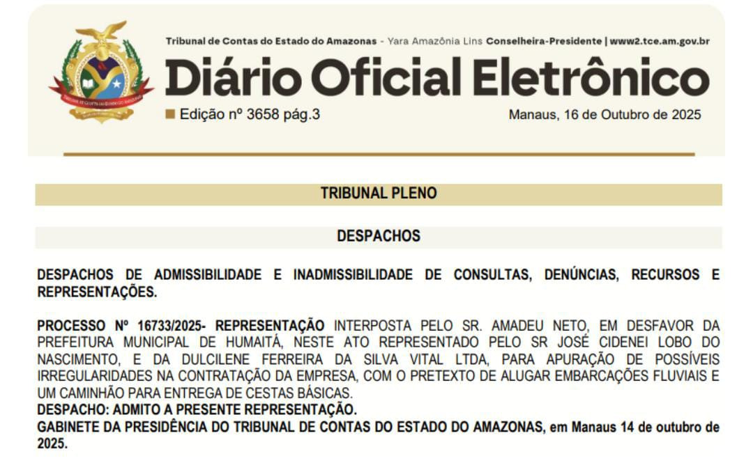 Humaitá (AM|) – O Tribunal de Contas do Estado do Amazonas (TCE-AM) admitiu uma representação protocolada pelo vereador Dr. Amadeu Neto contra o prefeito Dedei Lobo, para investigar possíveis irregularidades na contratação da empresa Dulcilene Ferreira da Silva Vital Ltda, no valor de R$ 733,5 mil, para o aluguel de embarcações fluviais e um caminhão destinados à entrega de cestas básicas em Humaitá.