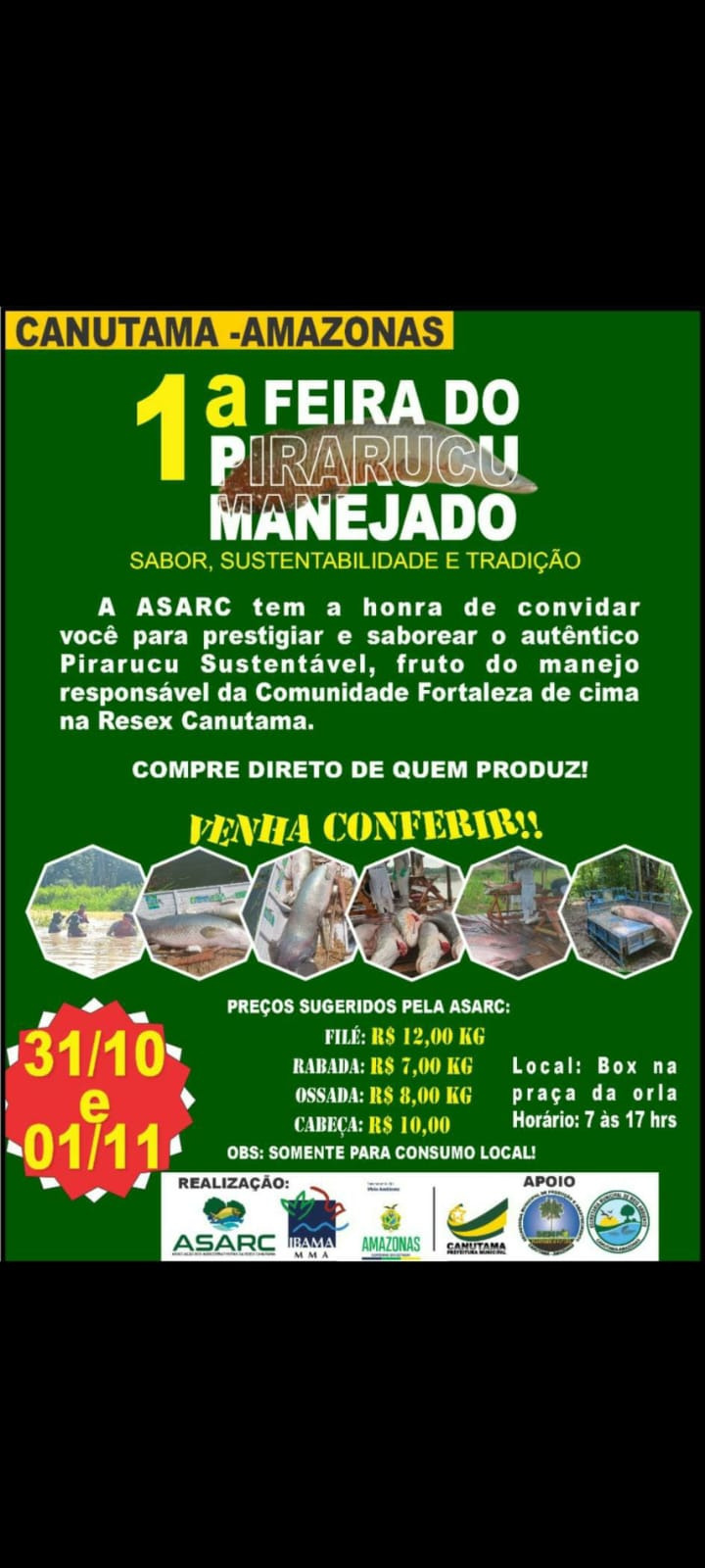 O evento acontecerá no Box da praça da orla, das 7h às 17h, e contará com a venda do pescado a preços sugeridos pela ASARC, reforçando o lema: "Compre direto de quem produz!".
