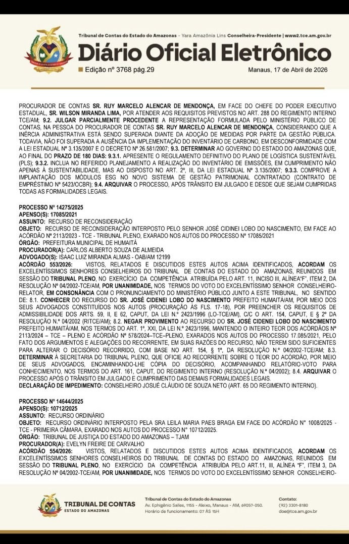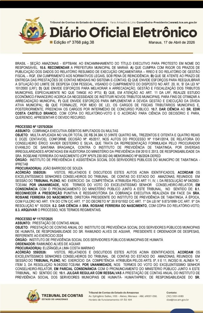 Fonte: Diário Oficial Eletrônico do Tribunal de Contas do Estado do Amazonas (TCE-AM), edição nº 3768, publicada em 17 de abril de 2026.