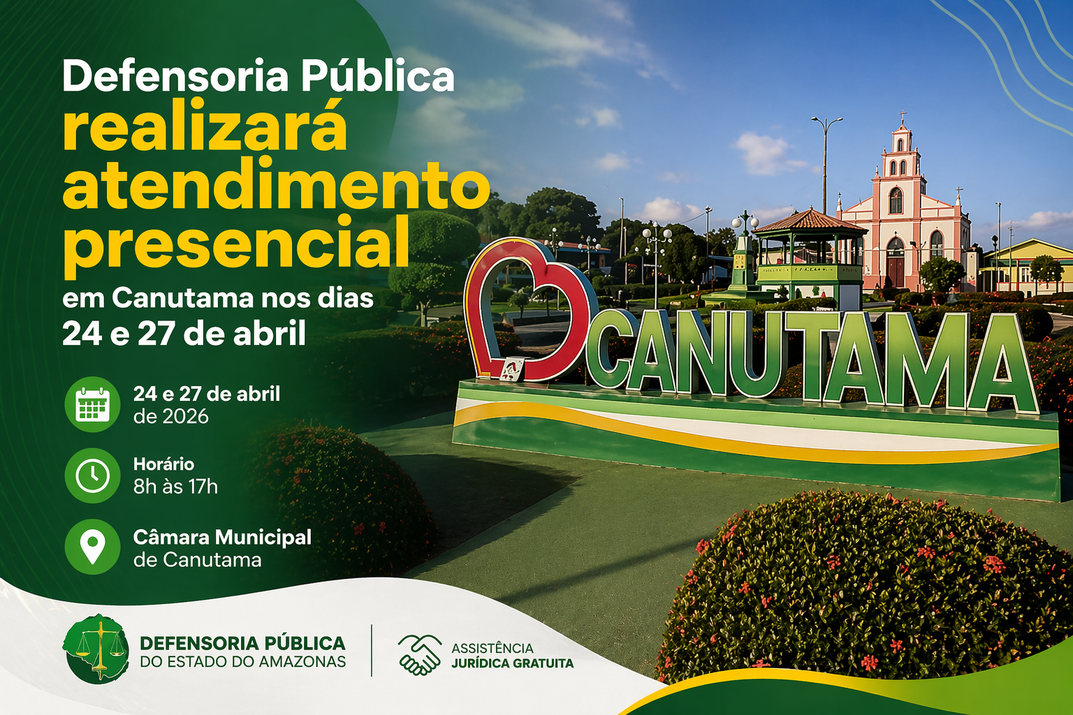 A população de Canutama terá acesso a diversos serviços jurídicos gratuitos nos dias 24 e 27 de abril de 2026, através de uma ação da Defensoria Pública do Estado do Amazonas (DPE-AM). O atendimento acontecerá na Câmara Municipal de Canutama, das 8h às 17h, por ordem de chegada.