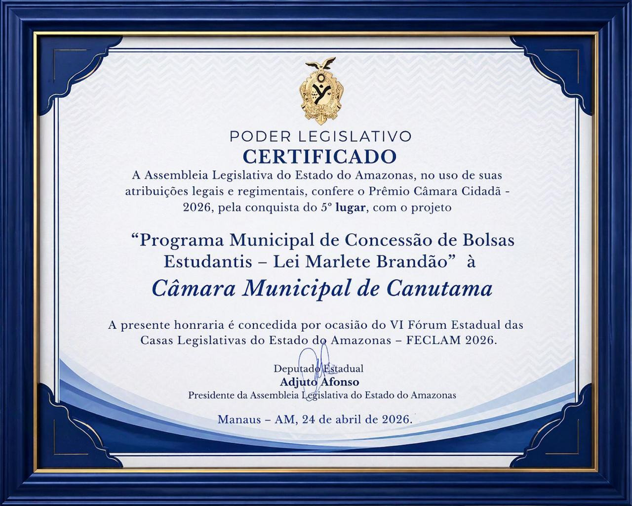 O certificado foi assinado pelo presidente da Aleam, deputado estadual Adjuto Afonso, destacando a relevância do projeto para a população canutamense.